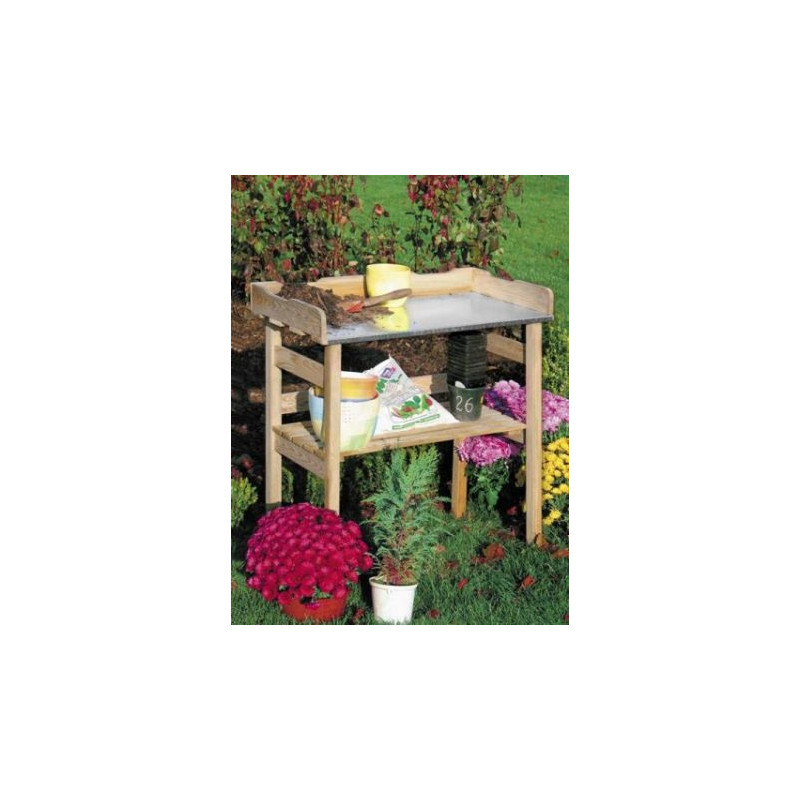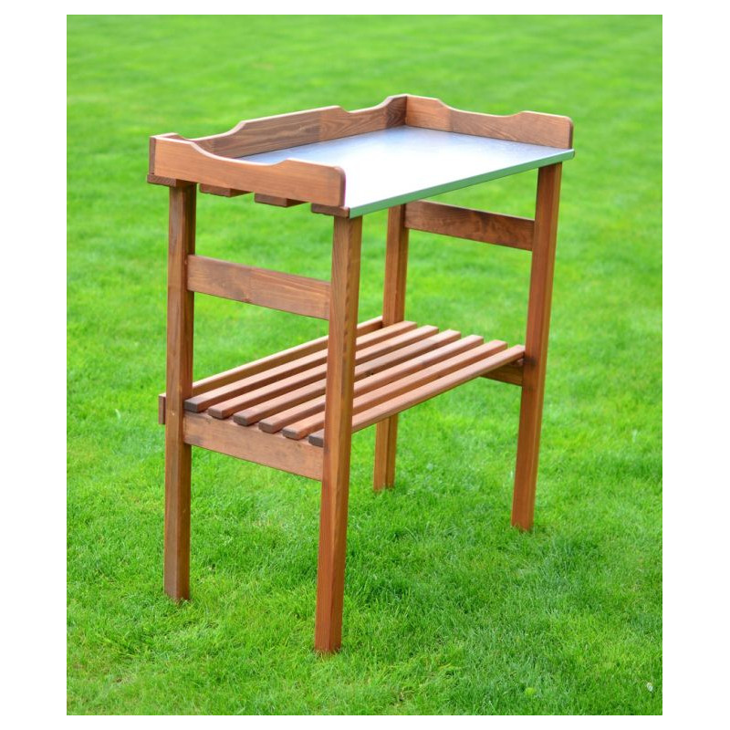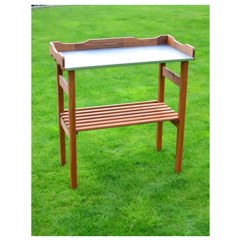 Stolík pre výsadbu z borovicového dreva a kovovej dosky. Vďaka kovovej doske je stolík ideálnym riešením pre výsadbu a presádzanie rastlín - jednoduchá údržba a stály materiál.
