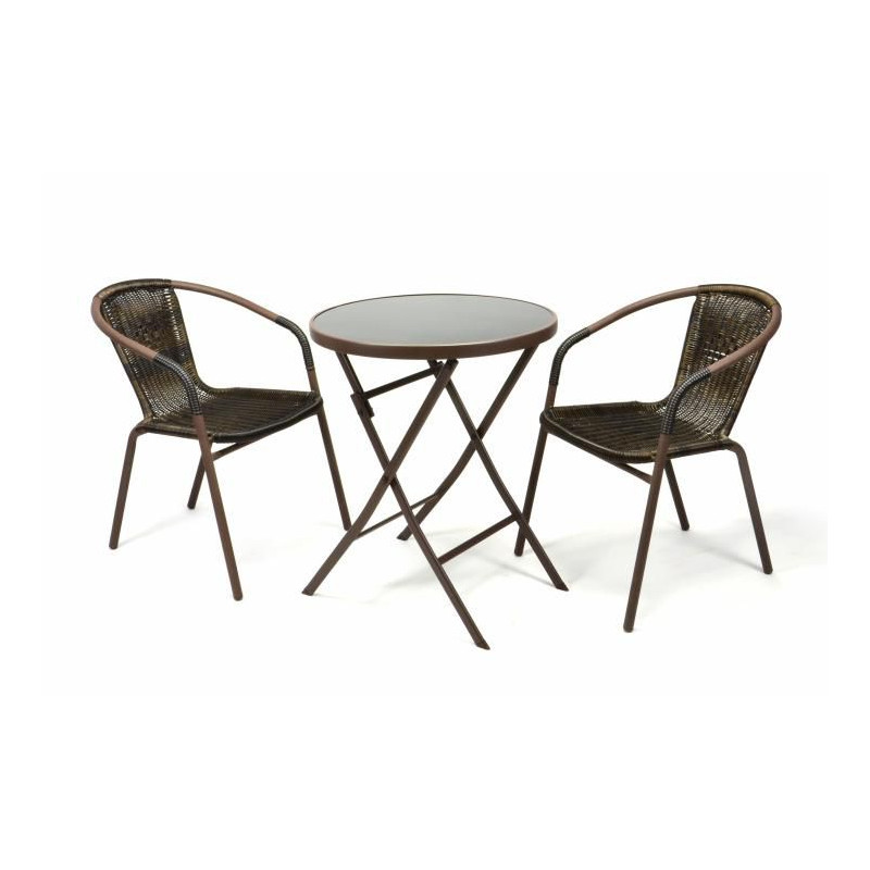 Ľahká, ale napriek tomu robustná kombinácia zo sklápacieho stolíka a 2 stohovateľných stoličiek s komfortnou polyratanovou sedacou plochou je veľmi pohodlná. Stolík je veľmi dobre uskladniteľný. Oceľový rám stolíka aj stoličiek je ošetrený práškovou vrstvou a nohy sú ukončené gumou. Použité materiály sú počasiu odolné, nevyžadujú údržbu ani špeciálne čistiace prostriedky.