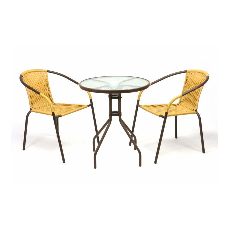 Ľahká, ale napriek tomu robustná kombinácia zo stolíka a 2 stohovateľných stoličiek s komfortnou polyratanovou sedacou plochou je veľmi pohodlná. Stôl má tiež otvor pre slnečník. Oceľový rám stolíka aj stoličiek je zakončený gumou. Použité materiály nevyžadujú údržbu, sú počasiu odolné a nevyžadujú špeciálne čistiace prostriedky.