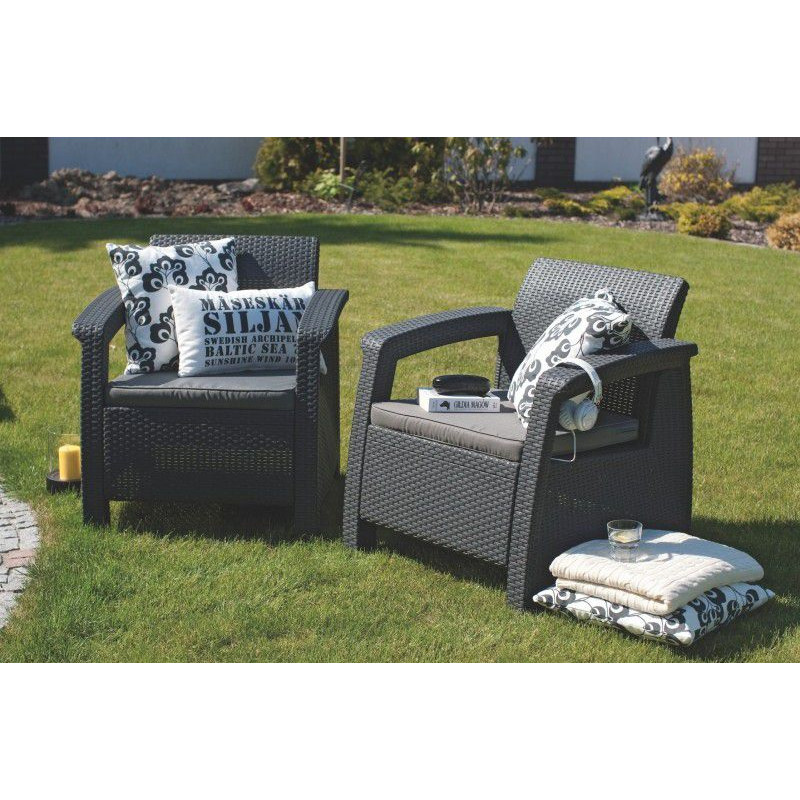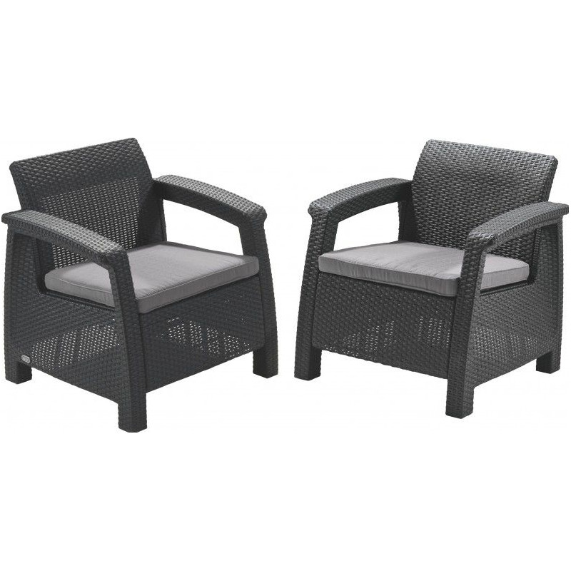 Set Corfu Duo se skládá ze dvou křesílek. Křesílka jsouzumělého plochého ratanu v barvě antracit + šedé podušky. Zahradní nábytek z umělého ratanu je odolný vůči různému počasí.