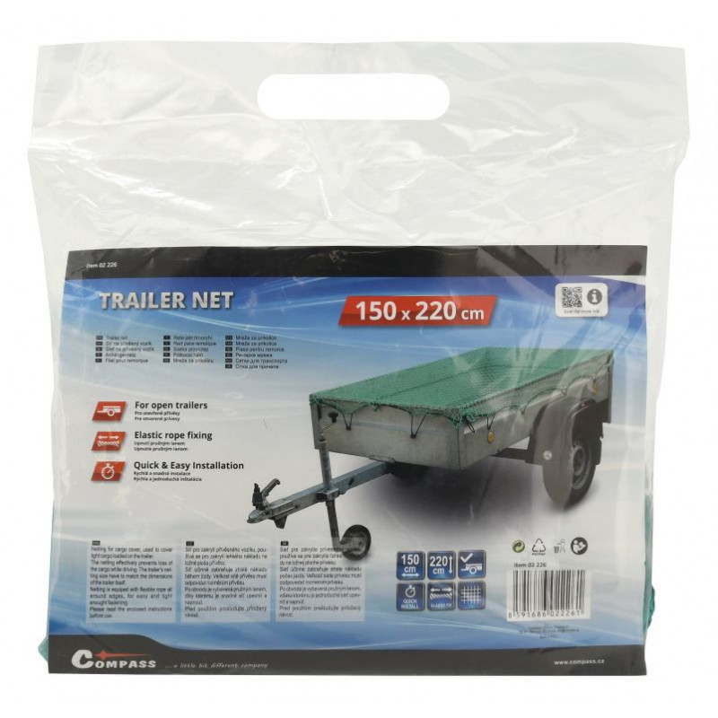 Sieť je zhotovená z odolného polypropylénu zelenej farby a je po obvode vybavená pružným lanom pre jednoduché a rýchle upevnenie a napnutie. Veľkosť siete musí zodpovedať rozmerom prívesu, táto sieť má rozmery 150 x 220 cm s okami štvorcového tvaru s rozmermi 4 x 4 cm.