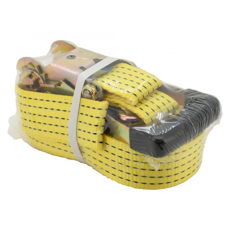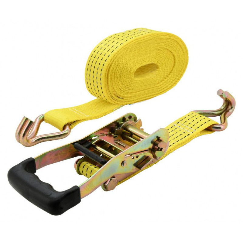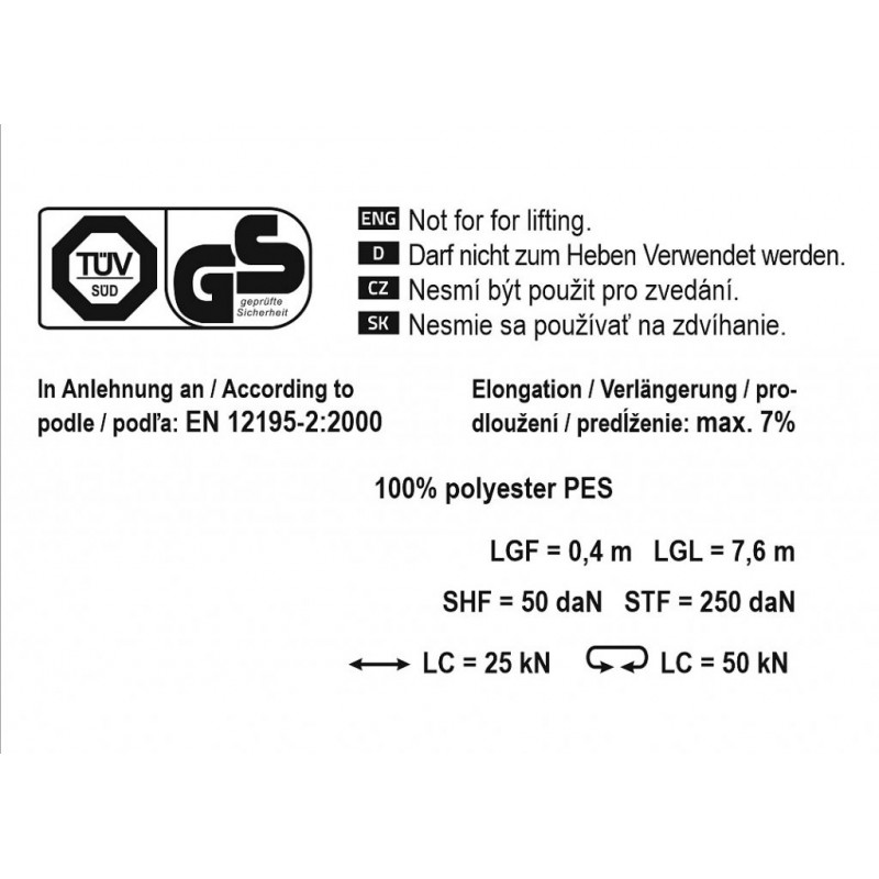 Upínací račňový popruh s kovovými hákmi, s homologáciou TÜV / GS, na zaistenie ťažkého nákladu. Račňa je celokovového prevedenia s odolným istiacim mechanizmom, opatreným plastovým madlom pre pohodlnú manipuláciu a ovládanie. Popruh šírky 50 mm s dĺžkou 8 m sa vyznačuje pevnosťou v ťahu 5000 kg (po obopnutí nákladu). Pri upínaní nákladu odporúčame používať plastové rohy alebo ochranné návleky. Bez použitia ochranných návlekov, alebo rohov, dochádza k zníženiu pevnosti upínacích pásov ak opotrebovaniu popruhu.