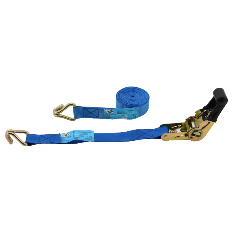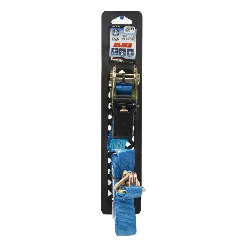 Račňa je celokovového prevedenia s odolným istiacim mechanizmom a poplastovanou rukoväťou pre pohodlnú manipuláciu a použitie. Popruh šírky 25 mm s dĺžkou 5 m sa vyznačuje pevnosťou v ťahu 700 kg (po obopnutí nákladu). Pri upínaní nákladu odporúčame používať plastové rohy alebo ochranné návleky. Bez použitia ochranných návlekov, alebo rohov dochádza k zníženiu pevnosti upínacích pásov a k opotrebovaniu popruhu.