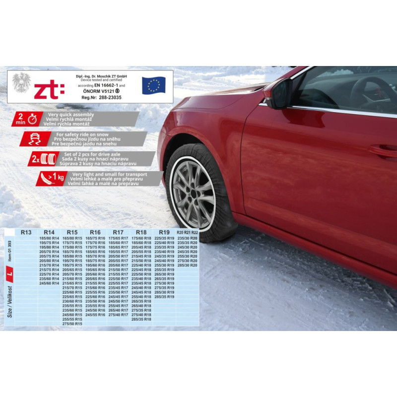 Reťaze sú vyrobené z vysoko odolnej technickej tkaniny a sú vhodné pre všetky osobné vozidlá vrátane vozidiel SUV a vozidiel 4x4. Hlboká štruktúra povrchu zaručuje bezpečnú jazdu na snehu a ľade. Horná strana je vybavená šípkou pre správny smer a orientáciu na pneumatike. Reťaze sa dajú opakovane používať. V porovnaní s bežnými kovovými reťazami textilné reťaze vynikajú nízkou hmotnosťou a dokonalou skladnosťou a nevyžadujú žiadnu špeciálnu údržbu. Po použití stačí opláchnuť nečistoty vlažnou vodou a nechať uschnúť. Vďaka svojim malým rozmerom reťaze nezaberú vo vozidle veľa miesta.