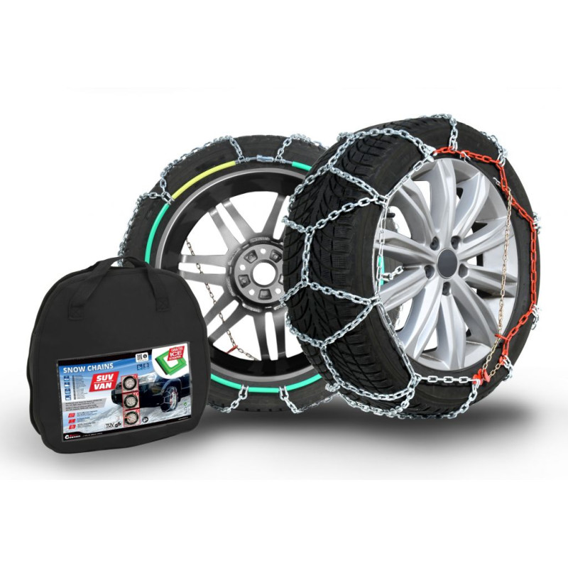 Štvorhranné články 27 x 16 mm sú prispôsobené proti pretáčaniu reťaze, čím výrazne zvyšujú záber kolesa. Sila materiálu 4,5 mm zaisťuje vysokú pevnosť, odolnosť a dlhú životnosť. Reťazová sieť je usporiadaná v špeciálnom tvare „X", zaručujúcom pokojnú a pohodlnú jazdu na zasnežených cestách aj na poľných cestách.