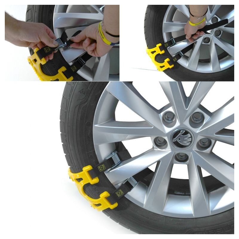 Univerzálne vyslobodzovacie pásy na núdzové vyslobodenie zo snehu i poľadovice. Pásy sú vhodné pre všetky bežné rozmery pneu (ALU aj oceľové disky). Dokonalé upevnenie, s rýchlou a zároveň jednoduchou montážou je zaistená sťahovacími pásmi s prackami.